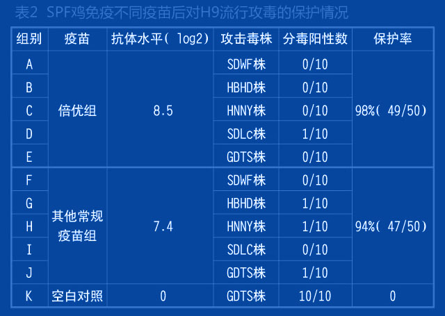 在實驗室條件下,SPF雞7日齡一次免疫倍優TM系列產品(ND+H9 ) 0.1ml,免疫后21天采用各地分離的流行H9毒株行攻毒,倍優組的攻毒保 護為98% (表2)。
