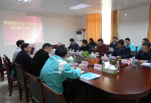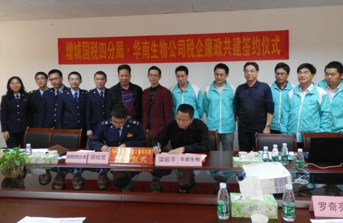 2012年12月14日上午,我司和增城國稅四分局組織舉辦了“增城國稅四分局·華南生物公司稅企廉政共建”簽約儀式,增城市國稅局領導鐘其立、陳繼文、胡桂榮、劉日雄、羅奇亮蒞臨我司出席儀式。