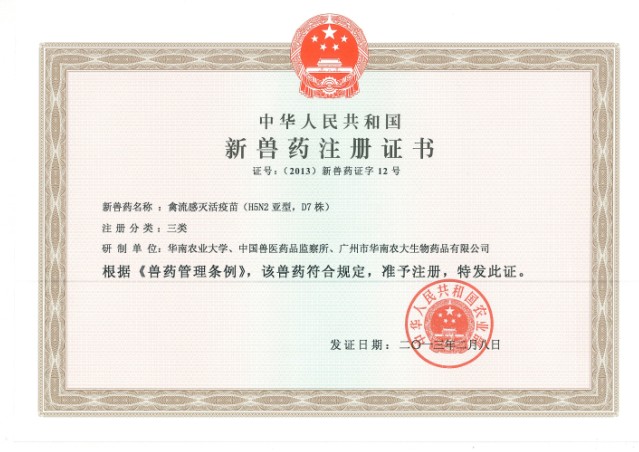 根據(jù)《獸藥管理?xiàng)l例》和《獸藥注冊辦法》規(guī)定,廣州市華南農(nóng)大生物藥品有限公司與華南農(nóng)業(yè)大學(xué)、中國獸醫(yī)藥品監(jiān)察所3家單位共同申報(bào)的禽流感滅活疫苗(H5N2亞型,D7株)通過了國家農(nóng)業(yè)部的審查,批準(zhǔn)為新獸藥。即將取得農(nóng)業(yè)部核發(fā)的《新獸藥注冊證書》,證書主要信息如下: