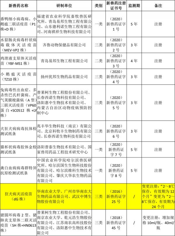 批準華南農(nóng)業(yè)大學等8家單位申報的狂犬病滅活疫苗(dG株)等2種獸藥產(chǎn)品變更注冊,自發(fā)布之日起執(zhí)行。