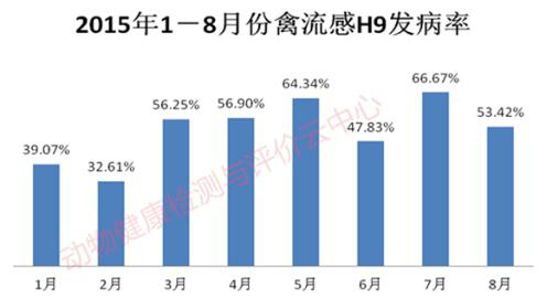 進入2015年禽流感H9的發病率一路飆升,雖然8月份禽流感發病率較7月份有所下降,但發病率依然占據很大的比例。同時根據檢測云中心對臨床數據的統計分析發現,第一雞群感染禽流感H9后,疾病所帶來的損失加大,如平均死淘率升高,個別病例死淘率日可達到2%;產蛋率波動幅度較大,開產雞群產蛋率不上升,嚴重的產蛋率下降,高者可下降10%左右。第二、禽流感H9成為養殖場的隱性殺手,當與其它疾病一起感染時,不易被診斷出來,如雞群長期腹瀉久治不愈,雖然臨床和剖檢看不到H9感染跡象的存在,當用實驗室檢測技術進行檢測時就會發現,腸炎久治不愈的原因與H9有很大的關系。第三由于禽流感H9持續感染的存在,有些雞群從環境中獲得了被動免疫,體內的抗體水平、體質和環境中的病毒攻擊力達到一定平衡,這樣的雞群沒有明顯的臨床癥狀,但當雞群受到外界應激時即平衡被打亂,極易發病,且治愈難度較大。基于以上情況對于禽流感H9的防控應從免疫、管理、生物安全等方面入手,制定一個全方位的防控計劃。