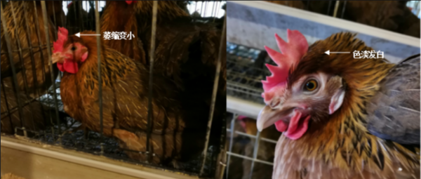 正常開產的成熟雞群雞冠、肉髯應該豐滿挺立,紅潤溫暖,感染IBV后出現異常的雞群會觀察到有部分雞的雞冠、肉髯萎縮變小、色淡發白,用手觸摸感覺冰涼。